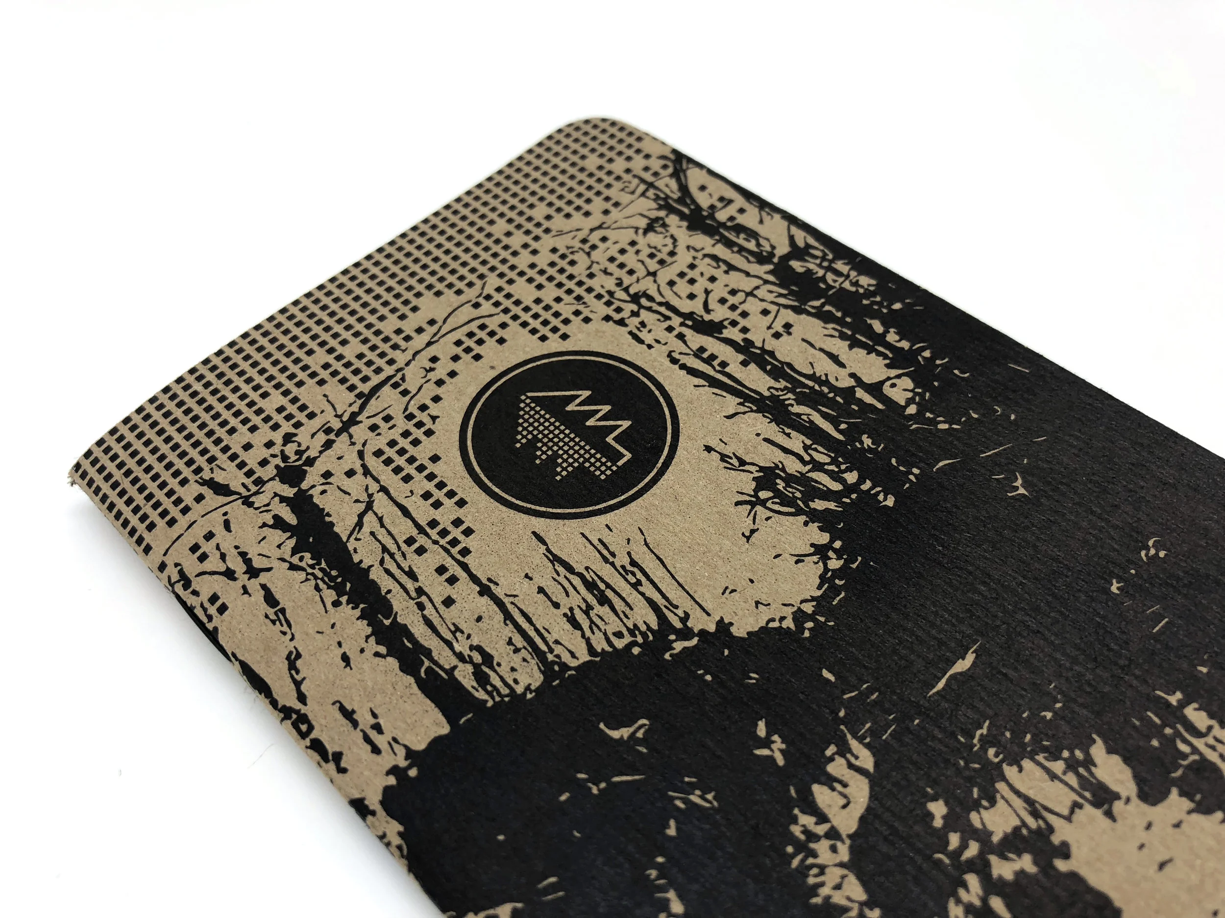 Inspired by this newest member of the Pixel & Timber team, Brandon wanted to capture some of its beauty in our latest round of pocket sketchbooks. Starting with a photo of the table top, Brandon adjusted the color of the image to pull the grain into sharper contrast, ultimately converting this image into usable vectors for printing. The output is a stylized balance of wood grain and negative space that captures the beautiful natural contours of the slab.