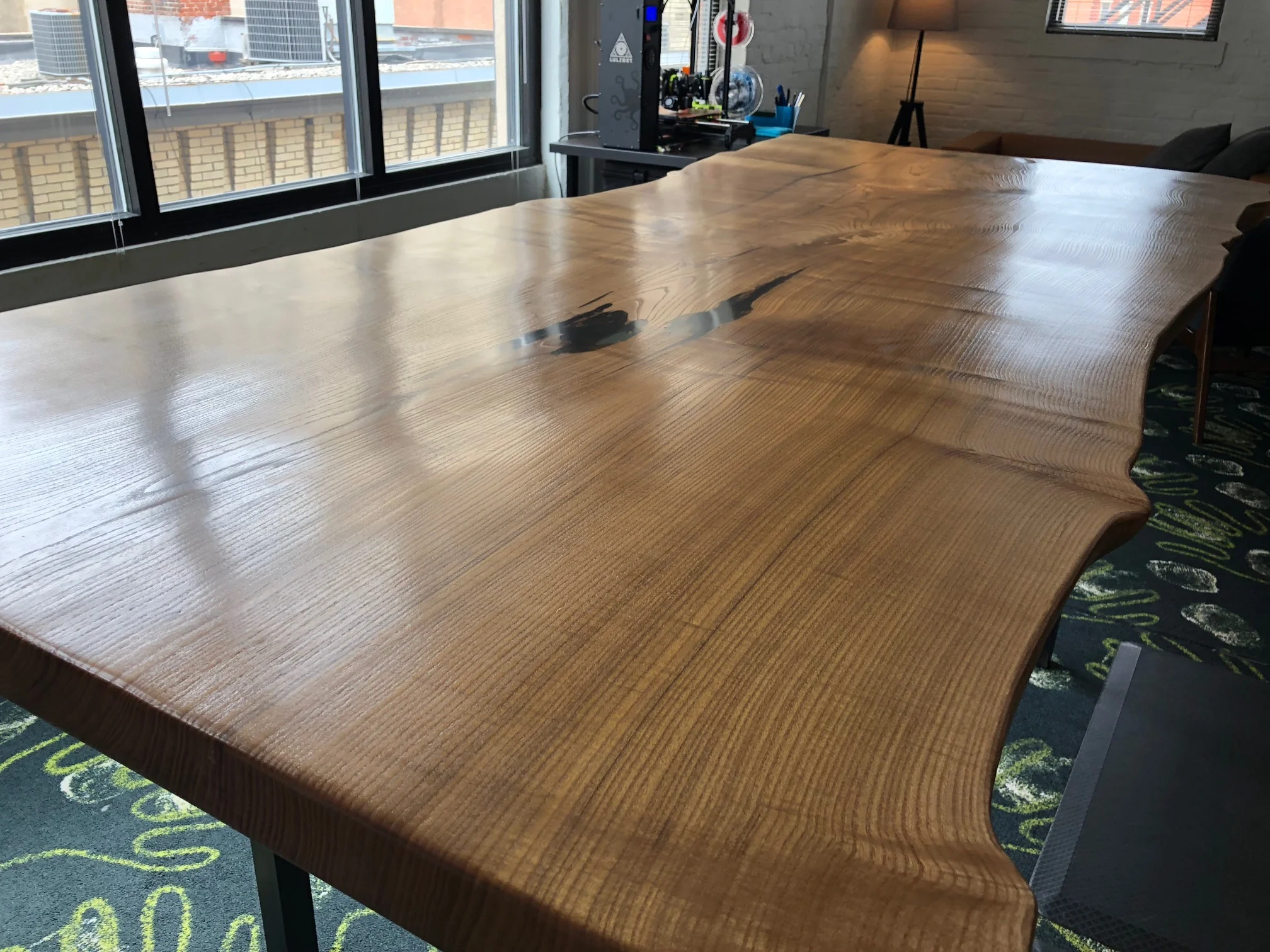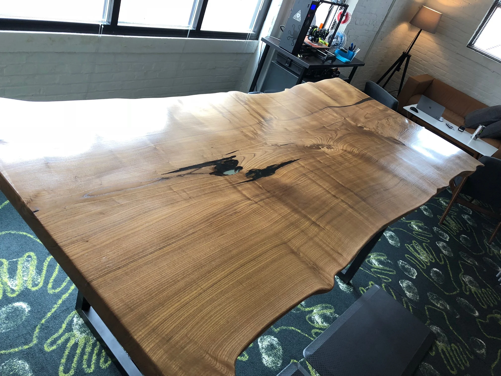 The physical beauty of the slab has to be seen to be appreciated. Rather than adapting this beauty to their own design, the craftspeople at Urban Timber chose to celebrate the natural beauty of the wood in its pure form. The grain pattern undulates around the natural splits and knots like water, and the the resin-filled splits catch light to reveal the beautifully gnarled wood inside the slab. Mounted to a sturdy, welded base and set at 42” tall (standing desk height), this piece has become the physical and symbolic centerpiece of our office. (Read more about the desk in this post by founder Brandon Leedy.)