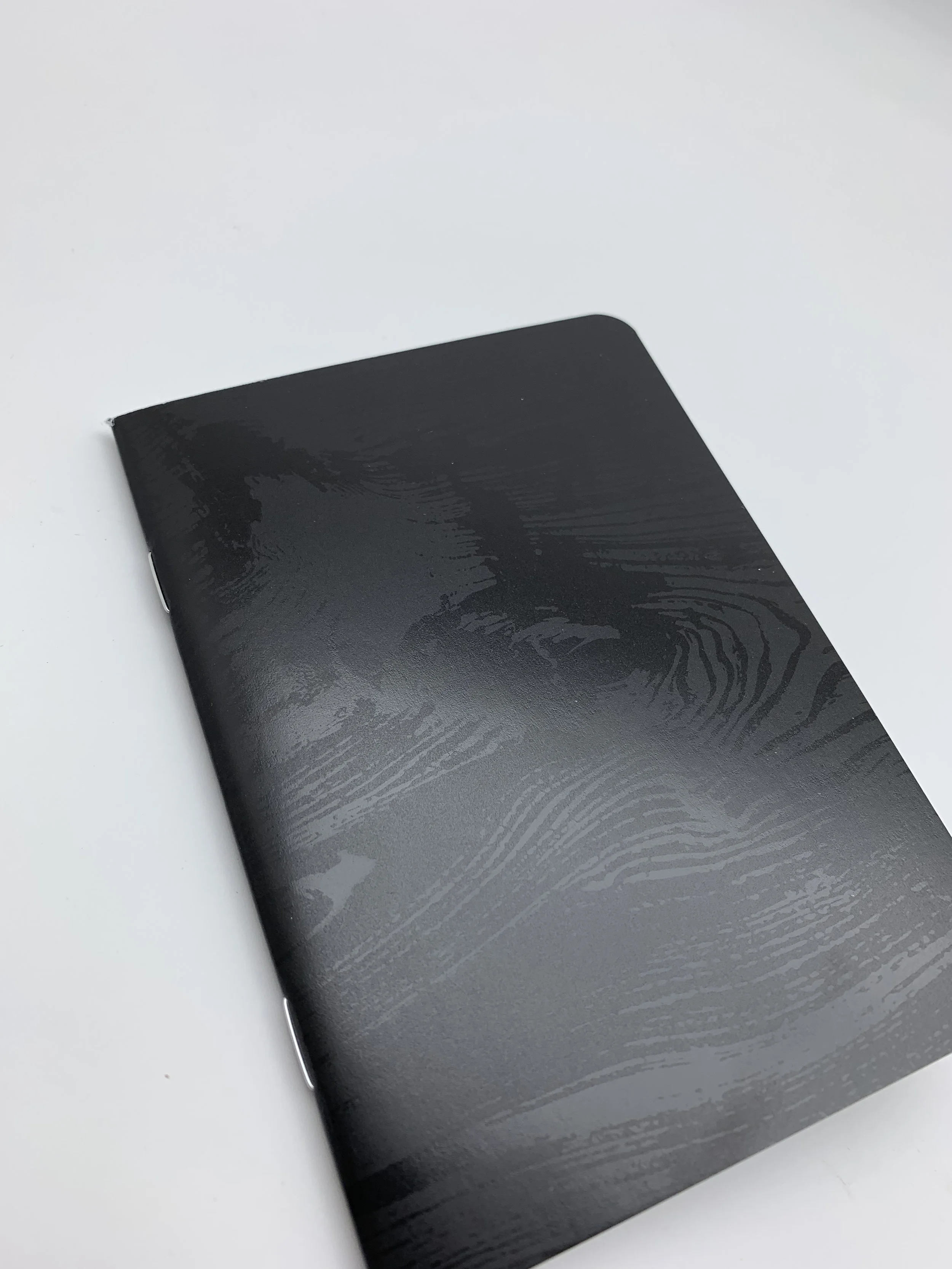 When it came to printing, Brandon wanted to create a look for these sketchbooks that was more unique than the previous round and evocative of the way the light dances across the grain of the desk. With help from the print team at Jakprints, we think the result turned out beautifully. By using their “strike-thru matte varnish” the grain pattern was printed black-on-black, with the grain catching glossy reflections in the light. From a distance, these look like simple, black pocket sketchbooks, but upon closer inspection, they come alive with the details of the grain.